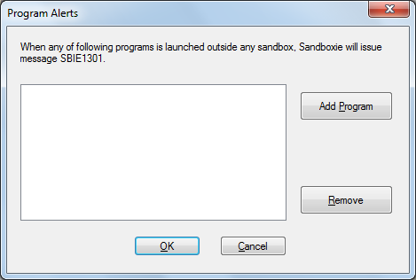 The Program Alerts command opens the following window in which you can configure Sandboxie to issue message SBIE1301 whenever specific programs start outside any sandbox.
