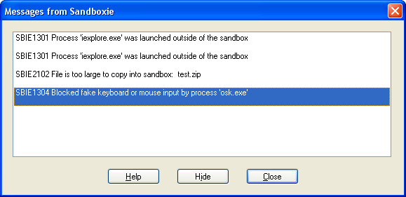 Note that messages are filtered by message code alone. For instance, the picture above shows message SBIE1304 with information detail osk.exe. Hiding that message will hide all future instances of message SBIE1304, regardless of the information detail.