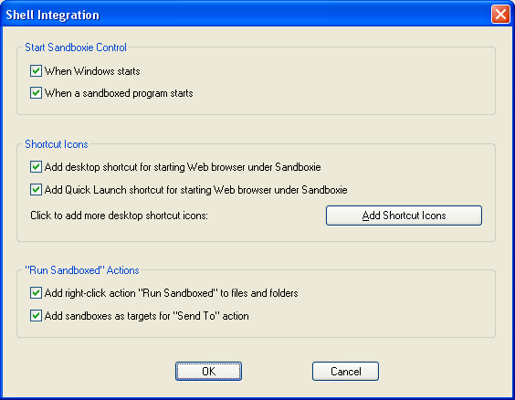 • Add Shortcut Icons creates a shortcut icon on your desktop to run a specific program under the supervision of Sandboxie. The program is selected from the Sandboxie Start menu. Note that if any programs were installed into the sandbox, the Sandboxie Start menu will include the shortcuts created during the installation, and they can be used to create desktop shortcuts. To remove desktop shortcuts created using Add Shortcut Icons, simply delete them from your desktop.