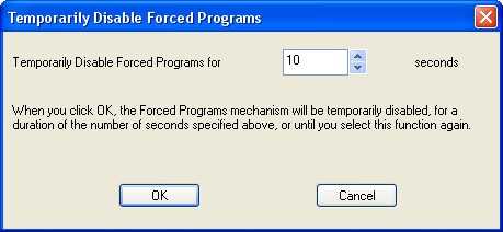 By default, forced sandboxing is suspended for 10 seconds. The number of seconds can be changed in the following dialog box, which appears when you select this command.