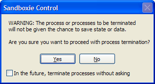 The Terminate All Programs command immediately stops all programs running in all sandboxes. There is no window associated with this command. However, you may be warned about the potential loss of any data processed by the programs which are about to be terminated: