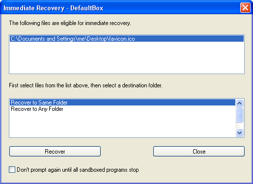 Immediate Recovery can be temporarily disabled until all sandboxed activity stops, by marking the checkbox Don't prompt again until all sandboxed programs stop at the bottom of the window.