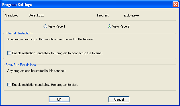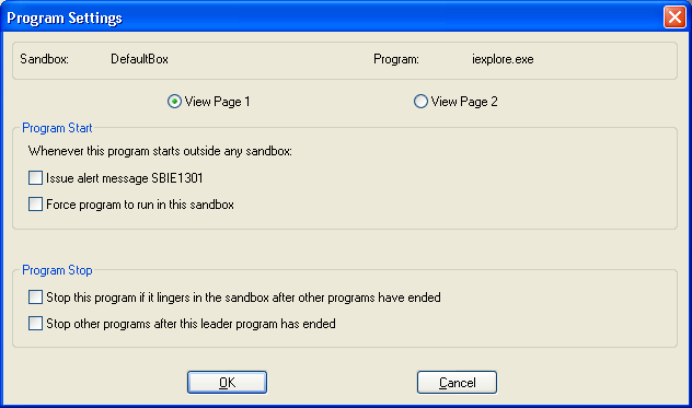 The Program Settings window displays the sandbox where the program is running, the name of the program executable file, and checkboxes for the quick configurations settings. It is composed of two pages. Switch between the pages using the View Page 1 and View Page 2 radio buttons.