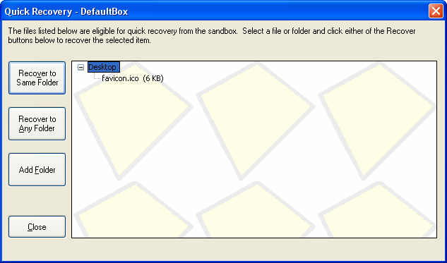Recover to Same Folder moves the file (or folder) from the sandbox to a corresponding location outside the sandbox. For example, the picture above shows the file favicon.ico in the sandboxed Desktop folder. Clicking this command on the file will move it to the real desktop folder.