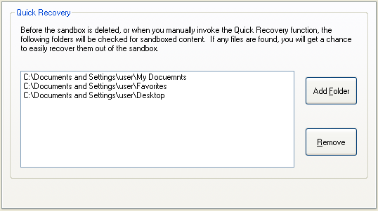 While you can manually explore the contents of the sandbox and extract the files you need, Sandboxie has a Quick Recovery tool that scans particular folders and informs you if any files are available for recovery out of the sandbox. The Recovery group configures this tool.
