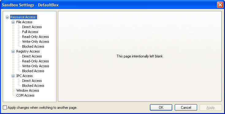 Allow direct access to a registry key resource. Note that Direct Access exclusions do not apply when the program itself resides in the sandbox. This is described in more detail in the File Access category above. Note that unlike in the File Access category, there is no Full Access access mode for registry keys.