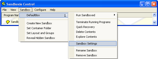 Note that unless new sandboxes are added, Sandboxie lists only one sandbox: DefaultBox.
