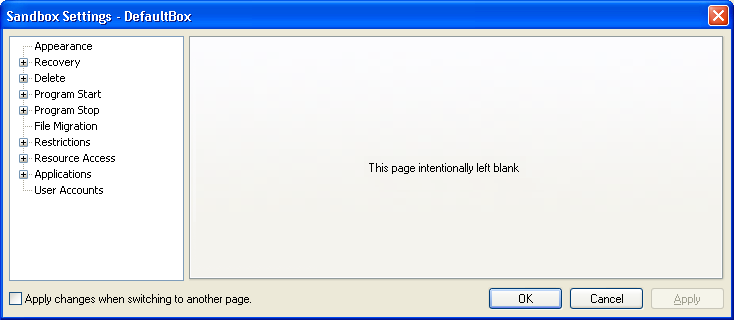 When a change has been made in a particular page, the change must be applied to Sandboxie before moving to any other settings page. This can be done manually using the Apply button, or automatically by marking the checkbox at the bottom of the window ("Apply changes when switching to another page").