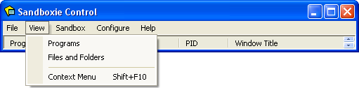 The Programs command selects Programs View, which displays the programs running in each sandbox. This is the default view.