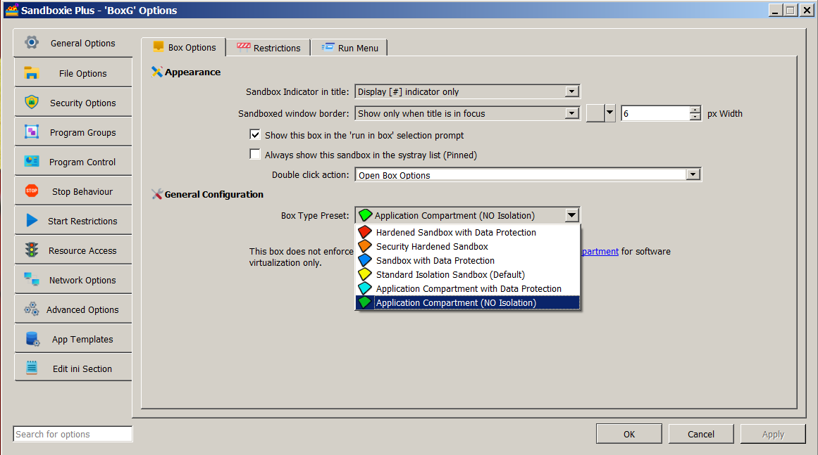 to the box settings section of Sandboxie.ini. It can also be enabled in the Sandman UI. Right-click on a box and select "Sandbox Options" from the drop-down menu (or simply double-click on a box) to bring up the Box Options UI. Select the Box Type Preset as "Application Compartment (NO Isolation)" (with a green box icon) and click OK to apply changes. The status column of Sandman UI labels this box as Application Compartment.
